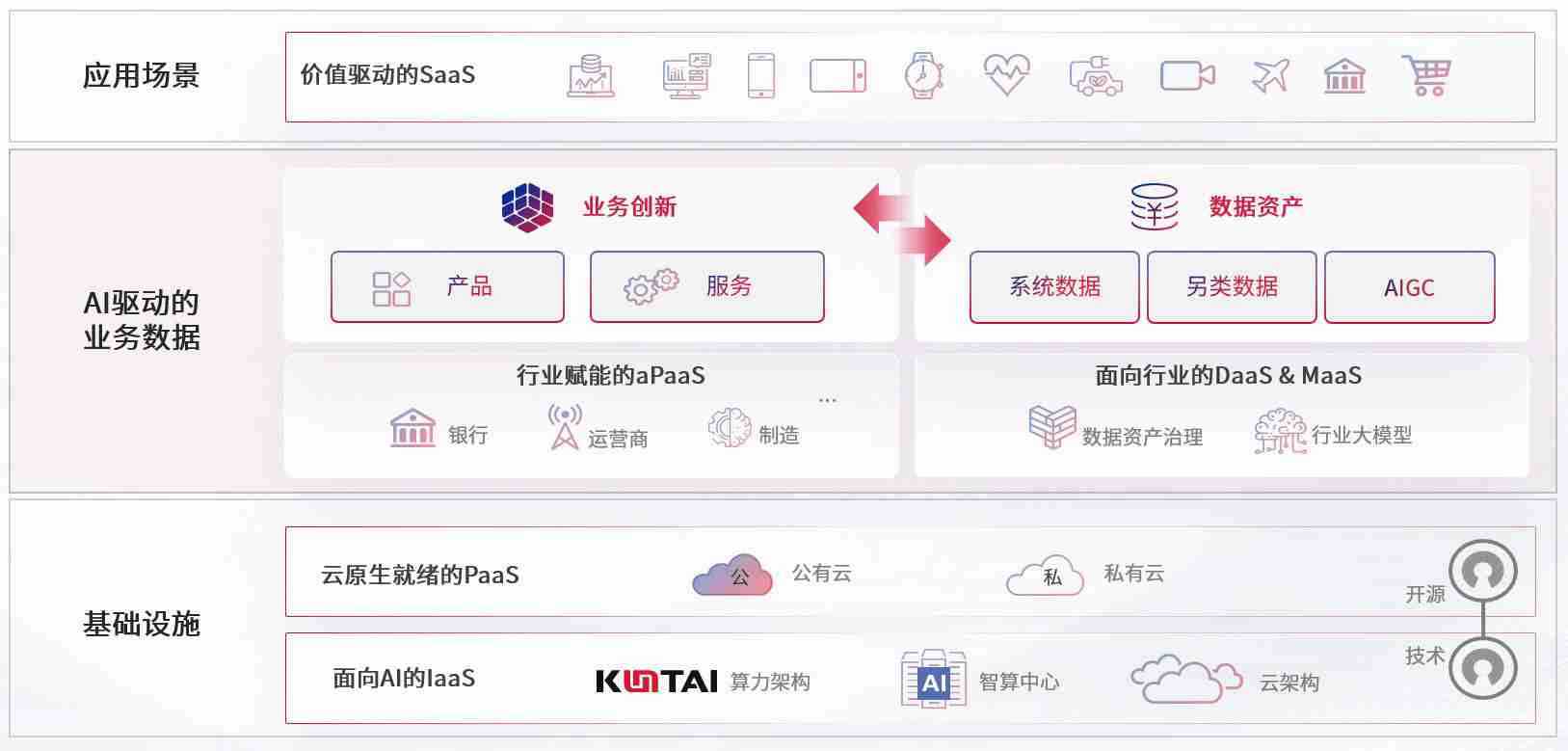 数字时代,,,,围绕企业数字化转型的关键要素,,,,星空真人数码开创性的提出数云融合战略和技术体系框架,,,着力在云原生、、、、数字原生、、、、AI原生和信创产业上架构产品和服务能力,,,为处在不同数字化转型阶段的快消零售、、、、汽车、、、金融、、、、医疗、、、、政企、、、、教育、、、、运营商等行业客户提供泛在的敏捷IT能力和融合的数据驱动能力,,,,构建跨界融合创新的数字业务场景和新业务模式,,助力企业级客户建立面向未来的核心能力和竞争优势,,,全面推动社会的数字化、、、智能化转型升级。。。
