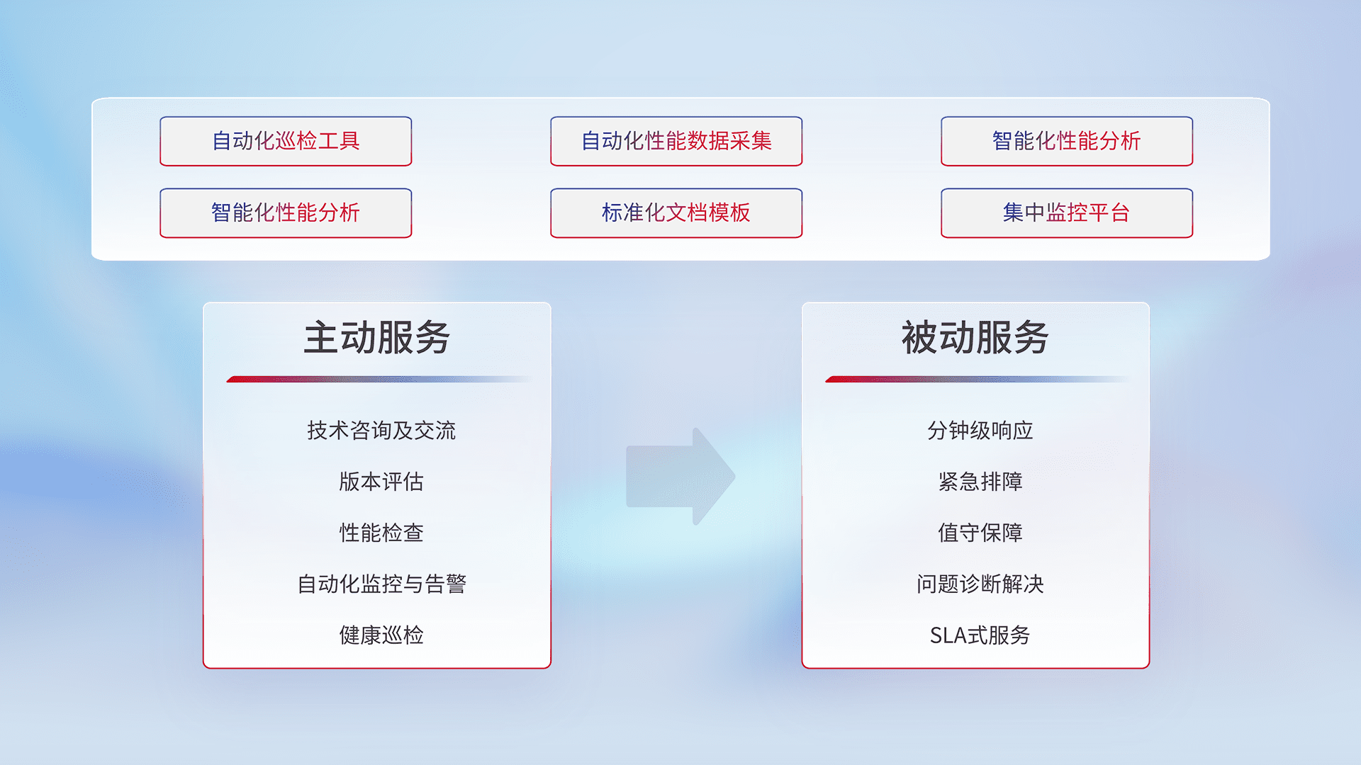 智能化工具和标准化文档,,,,保障服务质量,,,,提供主动服务(包含技术咨询、、版本评估、、性能检查、、自动化监控与告警、、、、健康巡检)和被动服务包含(分钟级响应、、、、紧急排障、、、、值守保障、、问题诊断解决、、、SLA服务)。。